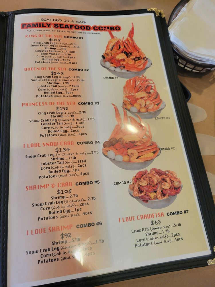2 lb. king crab leg (2 legs), 1 lb. shrimp (head off), 1 lb. snow crab leg (cluster half), 1 tail lobster tail (6 oz.), 2 pieces corn (cob in half), 2 pieces boiled eggs, 4 pieces potatoes (mini size).