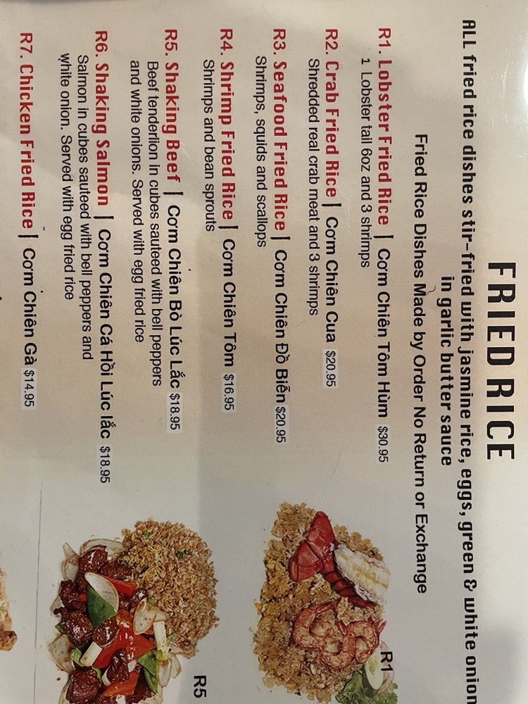 Salmon in cubes sauteed with bell peppers and white onion. Served with egg fried rice.